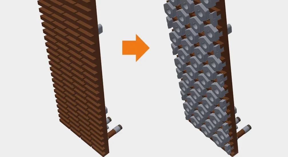 As an alternative to the completely new stave design, Primetals Technologies also considered an incremental change to the existing stave design in order to achieve the new benefits without changing the base stave. This takes an existing Primetals Technologies standard stave (left) and incorporates sliding inserts of single-piece inserts and spacers to produce the same honeycomb arrangement (right). The core benefits of the new copper-stave design are thus maintained.